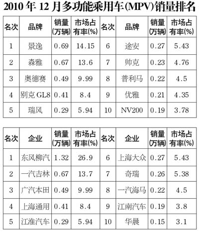 2010年12月多功能乘用車(MPV)銷售4.91萬輛,環比增長16.56%,同比增長56.88%;12月,自主品牌MPV表現依舊突出,其中景逸月銷量首次位居第一。12月銷量排名前十位的MPV品牌共銷售3.68萬輛,占MPV總銷量的75%。