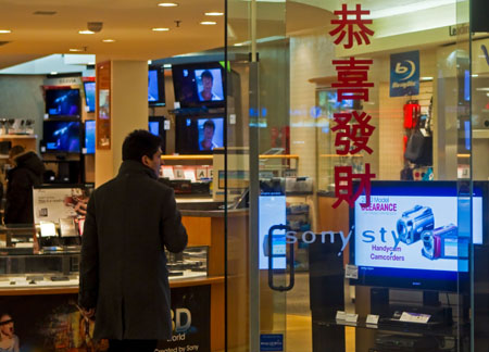 2月7日,加拿大多倫多地區的一家電器商店在玻璃門上貼出了中文春節賀詞。中國春節期間,多倫多地區的不少商家紛紛推出慶春節中文賀詞及廣告宣傳,吸引華人顧客。