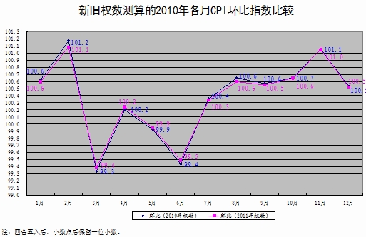 一是利用2011年新的權數構成和2010年已發布的CPI八大類別價格指數,對2010年各月的環比和同比價格總指數分別進行了測算,測算結果與已發布的價格總指數基本一致,誤差較小,銜接較好(詳見附圖)。