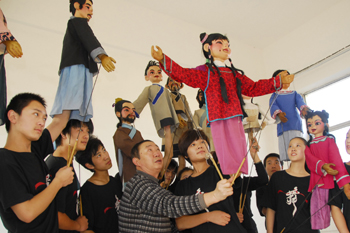 在由曾經的“煤老板”武礦生成立的孝行文化傳播公司里,學員們正在學習皮影戲表演技巧。記者 燕雁