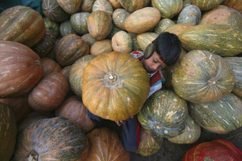 2010年12月3日,一名男孩在印度北部城市昌迪加爾的一家蔬菜批發市場內搬運南瓜。2010年新興和發展中經濟體的經濟復蘇步伐明顯快于發達經濟體,特別是以“金磚四國”——中國、印度、巴西、俄羅斯為代表的新興經濟體的國內生產總值增長率遠高于美、日、英和歐元區內的發達經濟體,成為推動世界經濟復蘇與增長的重要力量。新華社發 |