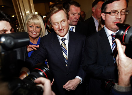 26日,愛爾蘭反對黨統一黨領袖恩達·肯尼(中)在都柏林出席支持者集會。恩達·肯尼說,他所領導的政黨已獲得議會眾議院選舉的勝利。他執政后將盡快就愛爾蘭援助方案舉行談判,以調整部分條款,減輕愛爾蘭的負擔。 債務危機爆發后,愛爾蘭接受歐洲聯盟和國際貨幣基金組織850億歐元援助方案,被迫實施大幅度削減赤字措施。援助貸款年均利率為5.8%。這一方案引發公眾強烈不滿。