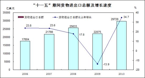 (一)貨物貿易規模迅速擴大!笆晃濉逼陂g,我國貨物進出口總額累計116806億美元,比“十五”期間增長1.6倍。其中,出口總額63997億美元,增長1.7倍;進口總額52809億美元,增長1.4倍。5年間,進出口貿易年均增長15.9%,其中,出口年均增長15.7%,進口年均增長16.1%,高于預定目標。