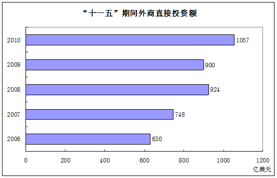 (一)利用外資規模躍居全球第二位!笆晃濉逼陂g,我國外商直接投資累計達到4260億美元,年均增長11.9%,是“十五”期間的1.6倍,全球排名由“十五”末的第四位上升至第二位,并連續18年位居發展中國家首位。2007年外商直接投資突破700億美元,2008年直接跨上900億美元臺階。即使是在國際金融危機沖擊較為嚴重的2009年,外商直接投資仍然超過900億美元,降幅遠遠低于全球平均水平。2010年,外商直接投資突破1000億美元,達到1057億美元,是“十五”末的1.8倍。