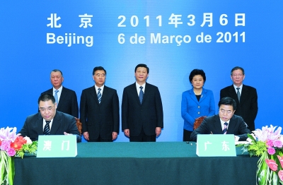 廣東省人民政府和澳門特別行政區政府6日在人民大會堂簽署了《粵澳合作框架協議》。雙方在協議中提出,將攜手建設亞太地區最具活力和國際競爭力的城市群,共同打造世界級新經濟區域,促進區域經濟一體化發展。