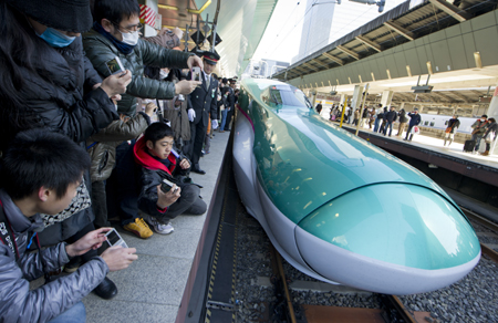 3月5日,在日本東京車站,“列車迷”爭睹新車。這列日本新干線速度最快的列車“隼”號現階段最高時速300公里,在首都東京與北部城市青森之間每天往返兩班,在東京與北部城市仙臺之間每天往返一班。