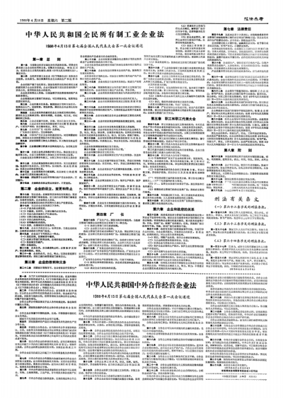 1988年4月16日《經濟參考報》第二版全文刊登了在七屆全國人大一次會議上通過的《中華人民共和國全民所有制工業企業法》(下稱“企業法”)和《中華人民共和國中外合作經營企業法》。這兩部法律的頒布順應了當時的經濟社會環境,其中企業法的頒布更是以法律形式確立了國企改革的階段性成果,在國企改革的初級階段起到了很大的推動作用。