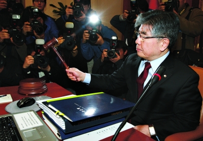 韓國中央銀行3月10日宣布將基準利率由2.75%上調至3%。 受國際金融危機影響,自2008年8月起,韓國央行將基準利率從5.25%逐漸下調至2%的歷史低點,并曾連續16個月保持這一基準利率不變。但迫于通脹壓力,韓國央行已于去年7月、11月以及今年1月先后三次將基準利率各上調0.25個百分點。圖為韓國央行行長金仲秀(右)當天在首爾出席韓國金融通貨委員會例會。新華社發