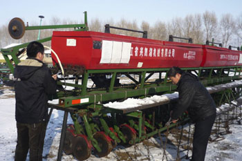 黑龍江墾區建設農場第二管理區農機工人在調試播種機。新華社發(周良君
