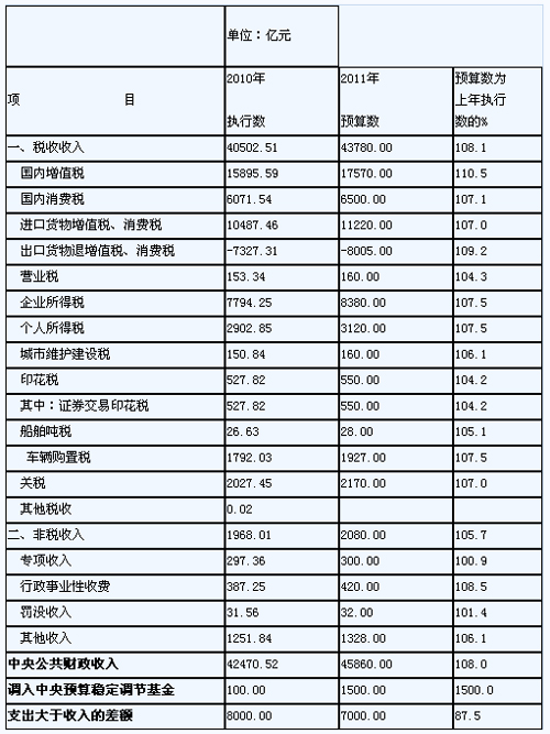 1.2011年國內增值稅預算數為17570億元,比2010年執行數增加1674.41億元,增長10.5%。主要根據2011年GDP、工業增加值預計增長情況等因素安排。
