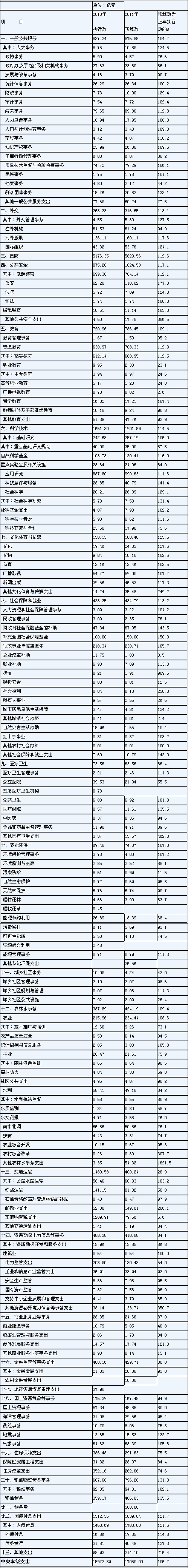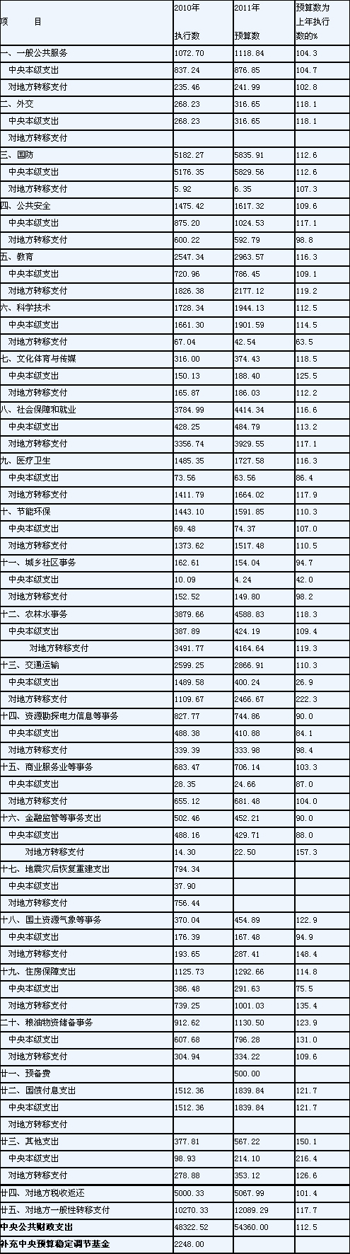 由于2011年政府支出科目發生變化,為了便于比較,2010年執行數按2011年科目口徑做了調整,具體調整內容詳見“2011年中央財政公共預算編表說明”。