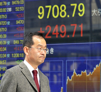 3月30日,在日本東京,行人經過電子股價顯示屏。受日元匯率走低及前一個交易日紐約股市上漲等因素影響,30日東京股市日經225種股票平均價格指數上漲2.64%,為11日大地震以來最高收盤值。