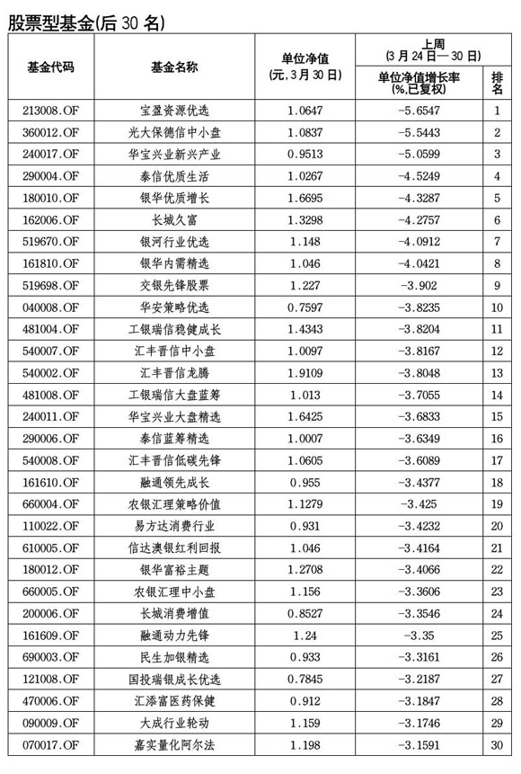 寶盈資源優選"榮登"本周最差收益股票型基金榜首。 寶盈基金管理有限公司旗下,以投資具有資源優勢的股票為主的股票型基金——寶盈資源優選以-5.65%的單位凈值增長率成為3月24日-30日期間收益最差的股票型基金。
