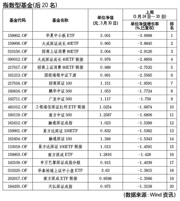 華夏中小板ETF"榮登"本周最差收益指數型基金榜首 華夏中小板ETF成為3月24日-30日單位凈值增長率最低的指數型基金,其標的指數為深交所編制并發布的中小企業板價格指數,基金主要投資于標的指數成份股、備選成份股。