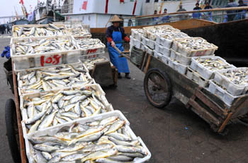 在浙江臺州海門港漁業市場碼頭,一車車鮮魚將被送往市場銷售。郟策