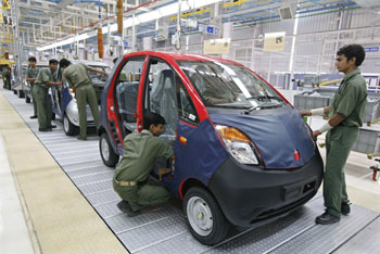 工人們在印度古吉拉特邦一座汽車工廠的生產線上組裝“Tata Nato”汽車。新華社發 |