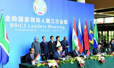 4月14日,金磚國家領導人第三次會晤在海南省三亞市舉行,“展望未來,共享繁榮”,是此次三亞峰會的主題。會議發表了《三亞宣言》,凝聚了金磚五國在各項會晤議題上的共識,明確了世界五個重要新興經濟體深化合作的方向和領域。金磚國家銀行合作機制成員行還簽署了《金磚國家銀行合作機制金融合作框架協議》,提出將穩步擴大本幣結算和貸款的業務規模,服務金磚國家間貿易和投資的便利化。同日,還舉行了由中國貿促會主辦的金磚國家工商論壇。 圖為金磚國家領導人出席《三亞宣言》簽字儀式。