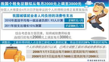 謝旭人表示,草案擬將減除費用標準由現行的每月2000元上調至每月3000元,調整后,工薪所得納稅人占全部工薪收入人群的比重,將由目前的28%下降到12%左右。