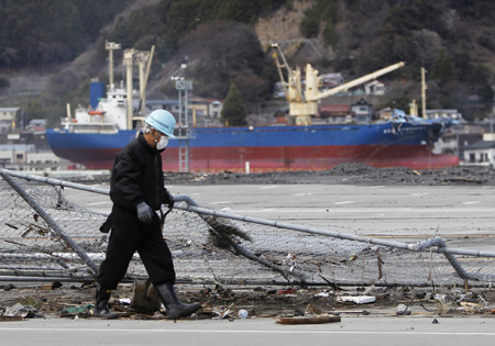 日本財務省20日公布的最新數據顯示,3月日本出口總額現16個月來首次下滑,同比下滑2.2%,主要因為3月11日地震海嘯產生的破壞。其中,汽車業出口額3月下滑27.8%,下滑幅度為2008年全球金融危機爆發以來最大。另外,由于物流不暢,電子產品出口同樣遇阻。 圖為4月20日,在日本巖手縣釜石市,一名工人在一處被地震和海嘯摧毀的港口行走。