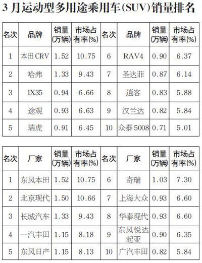 3月銷量排名前10位的SUV企業共銷售11.25萬輛,占SUV銷售總量的80%。與上月相比,排名前10位的SUV企業中,排名上升的有:東風本田上升四位,一汽豐田、奇瑞上升三位,北京現代、東風日產上升一位;排名下降的有:上海大眾下降六位,華泰現代下降四位,長城汽車、東風悅達起亞下降一位,廣汽豐田新進前十,眾泰汽車跌出前十。