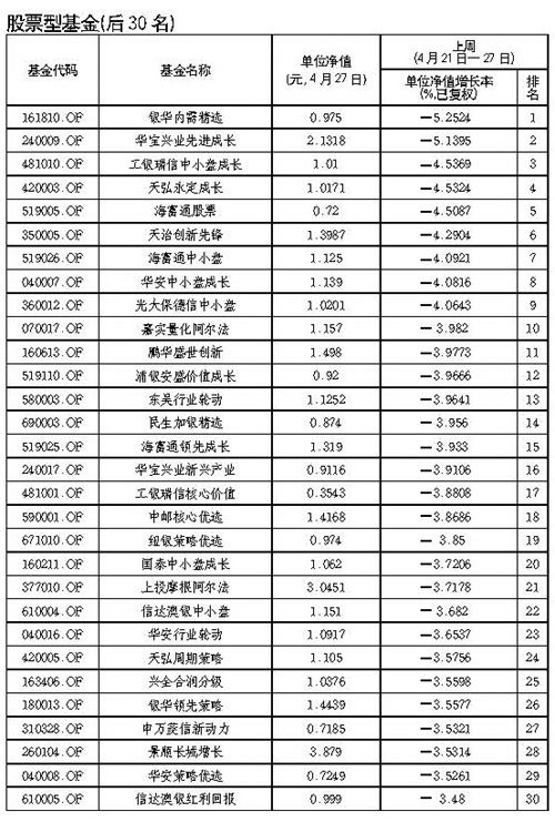 銀華基金公司旗下,2009年下半年上市的銀華內需精選以-5.25%的凈值增長率成為本周(4月21日-27日)股票型基金收益倒數第一,其今年年漲幅為-16.91%。