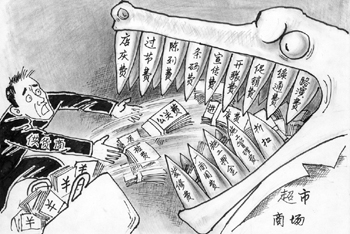 “超市一面極力壓低進價,一面又獅子大開口,收取各種費用,簡直把我們的利潤都要榨干了!毙⊥跆寡,“我們怎么辦?只能提高加價率,比如說,一瓶礦泉水成本價是1元,加價20%的話就是給超市報價1.2元,但是考慮到要產生的大約15%的通道費用,我們只能報價1.4元。如果不這樣做,就只能在原材料采購、生產等環節降低品質,說實話最終還是要轉嫁到消費者身上去!
