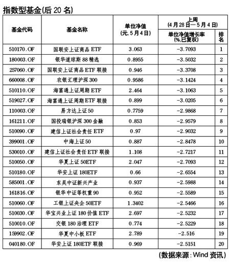 國聯安基金管理有限公司旗下的,2010年11月底設立的的國聯安上證商品ETF以-3.71%的凈值增長率成為本周(4月28日-5月4日)指數型基金收益倒數第一,其今年以來年漲幅為-5.92%。