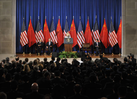 5月9日,第三輪中美戰略與經濟對話聯合開幕式在美國首都華盛頓舉行。中國國家主席胡錦濤特別代表、國務院副總理王岐山在開幕式上表示,圍繞確保經濟復蘇,中美之間政策措施既有互補,亦有碰撞,但合作的利益遠遠大于競爭的分歧。
