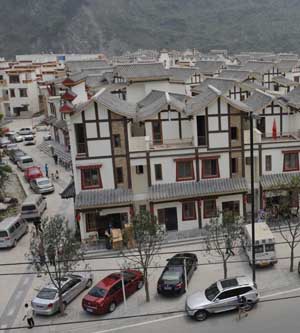 新建的映秀鎮街道上停滿了自駕游客的汽車。新華社記者