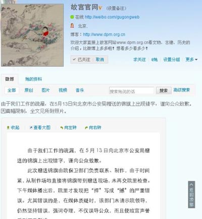 故宮博物院16日通過微博就其向北京市公安局贈送錦旗出現錯字一事,向公眾道歉。故宮在這份聲明中說,此次贈送錦旗由保衛部門負責聯系、制作,贈送前未“交院里檢查”。在媒體質疑時,該部門未請示院領導,仍然堅持錯誤,強詞奪理,不僅誤導公眾,而且使故宮聲譽受到嚴重影響。 故宮博物院日前向北京市公安局贈送錦旗,感謝警方迅速破獲展品被盜案。而一面寫有“撼祖國強盛,衛京都泰安”的錦旗,引起網友質疑,稱“撼”為錯別字,正確用字應為“捍”。面對質疑,接受媒體采訪的故宮相關負責人解釋說:“‘撼’字沒錯,顯得厚重。跟‘撼山易,撼解放軍難’中‘撼’字使用是一樣的!贝伺e引發外界更大的質疑,有語言文字方面的專家表示,“撼”字在這里肯定是錯別字。 16日,故宮博物院通過微博對外發布聲明,就此事向公眾道歉。 故宮方面的聲明全文如下。 由于我們工作的疏漏,在5月13日向北京市公安局贈送的錦旗上出現錯別字,謹向公眾致歉。 此次贈送錦旗由院保衛部門負責聯系、制作,由于時間緊,從制作場地直接將錦旗帶到贈送現場,未再交院里檢查。下午媒體播出后,院里才發現把“捍”寫成“撼”的嚴重錯誤。尤其錯誤的是,在媒體質疑時,該部門未請示院領導,仍然堅持錯誤,強詞奪理,不僅誤導公眾,而且使故宮聲譽受到嚴重影響。 事情發生后,院里即時進行認真調查,給予當事人嚴肅的批評教育,并采取了補救措施。故宮博物院現正組織全院各部門舉一反三,吸取教訓,堵塞漏洞,增強工作責任心,進行全面整改。