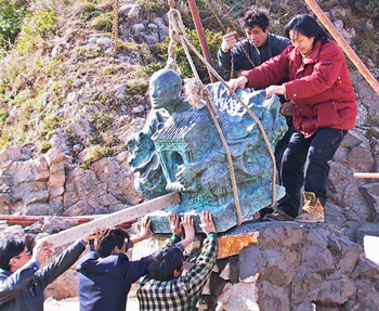 朱仁民在舟山普陀海洋雕塑公園(右一)與民工一起安裝日僧慧鍔銅像。新華社發 |
