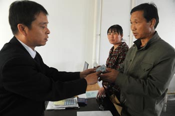 在烏魯木齊市米東區米東康居苑小區物業辦公室,白和西(右)從烏魯木齊房地產開發(集團)有限公司廉租房管理服務中心工作人員手中接過新房鑰匙。
