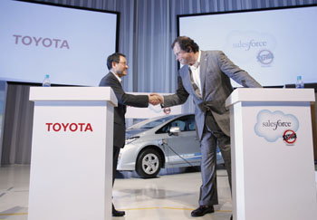 5月23日,日本豐田汽車公司總裁豐田章男(左)和美國Salesforce.com網站首席執行官馬克·貝尼奧夫在東京共同出席新聞發布會。 當日,日本豐田汽車公司和美國Salesforce.com網站在東京召開新聞發布會,宣布將建立一個面向豐田消費者的私人社交網站“豐田之友”,該網站將與即將上市的豐田電動車及插入式混合動力車同時發布。