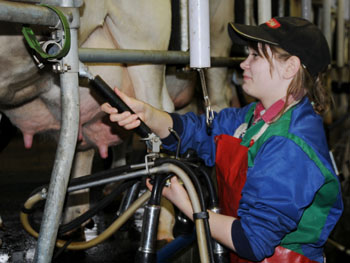 芬蘭南部一奶牛場的奶農嚴格按照瓦利奧公司《牛奶質量手冊》規定的牛奶生產守則為奶牛消毒和擠奶。記者 趙長春