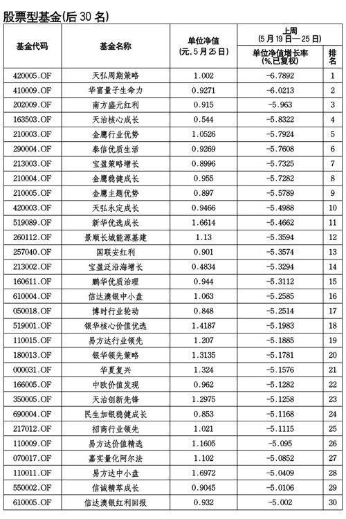 天弘基金管理有限公司旗下,2009年12月成立的天弘周期策略以-6.79%的凈值增長率成為本周(5月19日-25日)股票型基金收益倒數第一,其今年年漲幅為-13.23%。