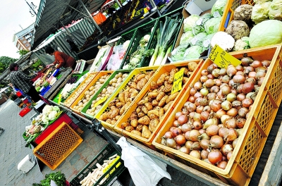 5月28日,在德國北部城市羅斯托克的一個蔬菜銷售攤位,消費者選購蔬菜。