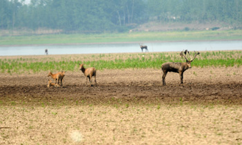 湖北石首麋鹿國家級自然保護區位于長江新舊河道的夾角處,總面積2.3萬畝。目前,生活在這里的近400頭麋鹿正遭受著前所未有的干旱危機。正處發情交配期的麋鹿,沒有適合發情交配的沼澤環境,可能推遲交配,甚至不交配。干旱還會導致保護區內的濕地旱化,給麋鹿的草料、食物及生存帶來困難。為保證麋鹿飲水,保護區已修建30多個水槽,定期加水供麋鹿飲用。圖為幾只麋鹿在石首麋鹿國家級自然保護區內覓食。記者