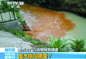 哈爾濱城區有條河溝流經哈藥總廠,記者發現,河水在進入這個廠區之前是青白色的,但從廠區流出就變成土黃色,散發著非常刺鼻的臭味。記者在廠區深處順著河溝尋找,發現了藥廠污水排放口。排污口散發著惡臭,水是黃色的。