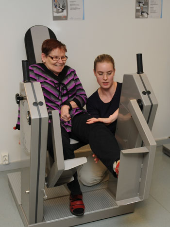 芬蘭首都赫爾辛基東部護理老人公寓里設有健身房,老人在護理人員的指導下進行康復鍛煉。 記者 趙長春