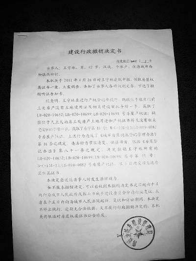 海城市城建局發給王守林的《建設行政撤銷決定書》。王晨