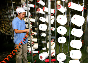 圖為上海崇明島上的飛逸紡織廠員工正在生產線上忙碌。記者