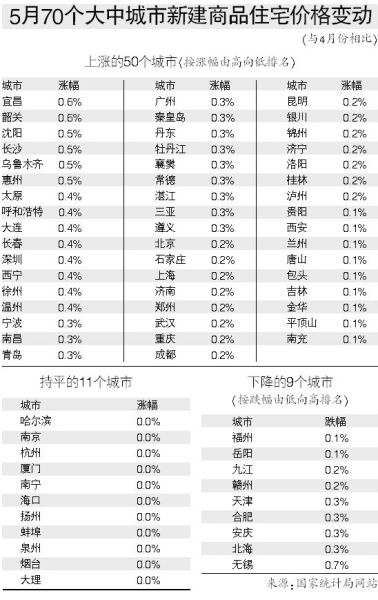 與去年同月相比,70個大中城市中,新建商品住宅價格下降的城市有3個,分別是杭州、三亞、南充;漲幅回落的城市有36個。5月份新建商品住宅價格同比(比上年同期)漲幅在5%以內的城市有36個,比4月份增加了7個。