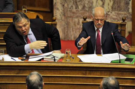 6月22日,希臘總理帕潘德里歐(右)在雅典議會會議上與新任財政部長韋尼澤洛斯握手慶祝贏得議會信任投票。 希臘總理帕潘德里歐日前對內閣成員進行大幅調整,以緩解民眾及執政黨內部對實施更強力緊縮政策的不滿情緒,并加大推動改革的力度。