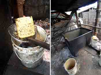 在東莞,被查處的窩點位于東莞塘廈鎮蛟乙塘社區恒星小學附近。整個廠區就只是一個簡易的棚子,里面架了兩口長約2米、寬1米的大鐵鍋,鐵鍋下方挖了深坑以便燒火加溫。鐵鍋旁,用編織袋裝著的泔水還滴滴答答滲出油水。何勇說,在加熱時自己拿著一根約兩米長的大鐵鍬在鍋里攪拌,在加熱到一定溫度后,油脂就會漂浮上來,然后用勺舀進旁邊的藍色鐵皮的大油罐。