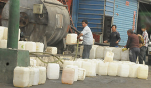 糧油批發市場是“地溝油”的另外一個重要去向。知情人告訴記者,加工窩點把油用油罐車運到批發市場后,批發市場的商戶再把油分裝到一個個幾十斤裝的白色汽油桶里。這些散裝油桶一般沒有任何標識。