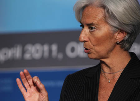 國際貨幣基金組織6月28日宣布,法國經濟、財政與工業部部長克里斯蒂娜·拉加德被選為該組織新一任總裁,成為該組織自1944年成立以來首位女性總裁。 這是拉加德在法國巴黎舉行的國際經合組織一次論壇會議上講話的資料照片(4月28日攝)。