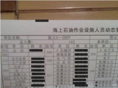 如果按照這張圖片顯示的住宿名單來看,這個海上平臺無疑存在超員的現象,該網友稱,“一個有2艘救生艇的平臺,一共可以乘坐120人,怎么有143人在平臺上”。他表示,如果海面發生漏油火災,那么剩下的23個人將得不到有效救援。他說,如果剩下的23人不乘坐救生艇,而是乘坐非密閉的救生筏,那么在海面有火有毒的環境下,這些人的性命堪憂。
