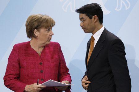 德國總理安格拉·默克爾領導的中右執政聯盟內部就降低稅收達成共識,定于7月6日提交內閣審議,下一個議會選舉年著手落實。德國國際通訊社(DAPD)7月3日獲得一份備忘錄,涉及默克爾及其執政聯盟伙伴的商議結果,但沒有提及具體減稅金額。 圖為默克爾(左)與德國經濟部長菲利普·勒斯勒爾2011年5月16日在柏林出席新聞發布會的資料照片。