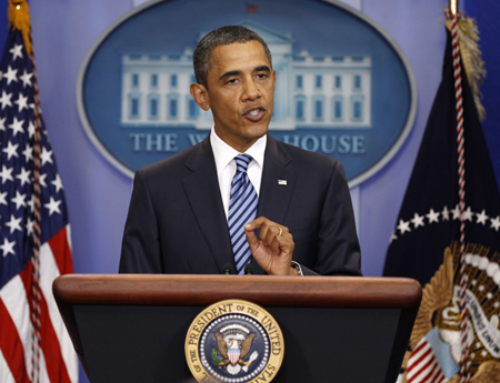 7月5日,在美國首都華盛頓,美國總統奧巴馬在白宮舉行的新聞發布會上講話。 奧巴馬5日表示,他將于7日與國會兩黨領導人在白宮繼續就削減赤字和提高公共債務上限議題舉行商討,他強調兩黨要通過合作來推進談判進程。