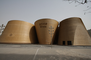 圖為位于上海世博園區內的萬科館。由于建筑外墻面使用了秸稈板,萬科館宛如金燦燦的麥垛矗立在浦江西畔。 |